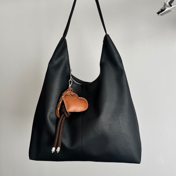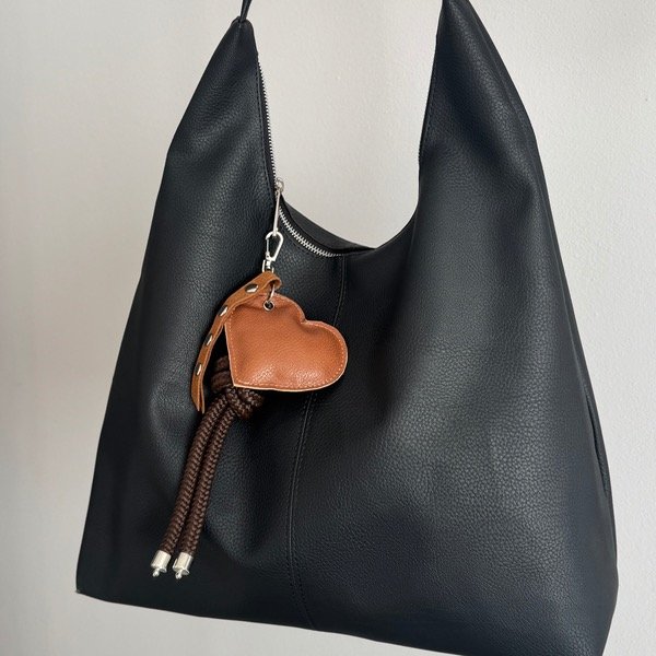 Charm HEART 🤎 para darle un golpe de estilo a tu bolso. Corazón de cuero camel con tachas plateadas y cordones marrón oscuro que caen como flecos, creando un mix entre romántico y urbano. Se engancha en segundos al asa y transforma tu cartera en un accesorio canchero, con personalidad y un guiño western que no pasa desapercibido.