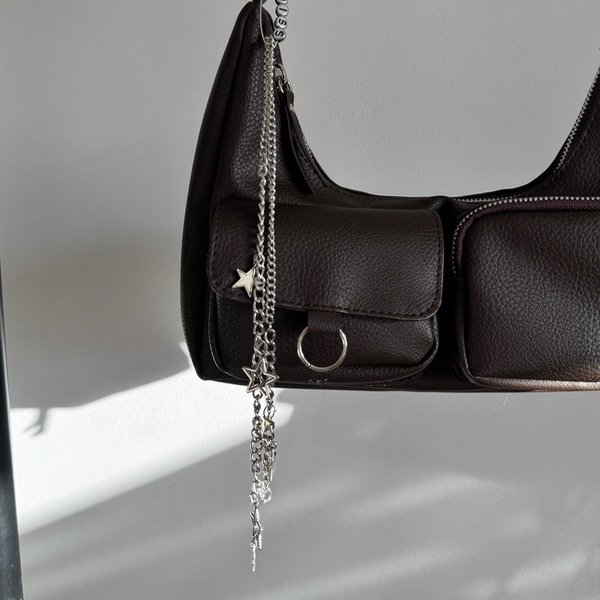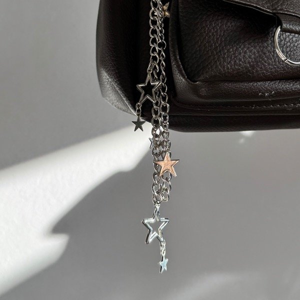 Una cascada de cadenas plateadas con mini estrellas metálicas que se mueven con cada paso y captan la luz como un highlight. Se engancha fácil al asa y le da a tu cartera esa vibra canchera, urbana y con brillo sutil, perfecta para que tu look pase de básico a estrella de la noche.